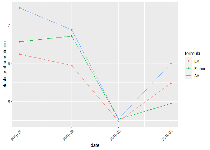 The User may also generate an artificial scanner dataset where prices are lognormally distributed and quantities are calculated under the assumption that consumers have CES (Constant Elasticity of Substitution) preferences and their spending on all products is fixed (see the generate_CES function). Please watch the following example: