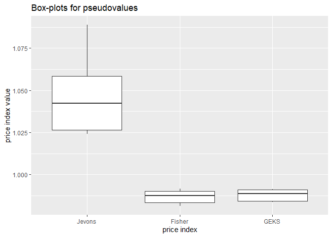 This function presents a comparison of selected indices obtained by using the jackknife method. In particular, it returns a list with four elements: iterations, which is a data frame with basic characteristics of the calculated iteration index values (means, standard deviations, coefficients of variation and results for all sample), pseudovalues, which is a data frame with basic characteristics of the calculated index pseudovalues obtained in the jackknife procedure (i.e. the jackknife estimators and their standard deviations and coefficients of variation), figure_iterations which presents a box-plot for the calculated iteration index values, and figure_pseudovalues which presents a box-plot for the calculated index pseudovalues obtained in the jackknife procedure. Please follow the example, in which the Jevons, Fisher and GEKS indices are compared by using the jackknife method: